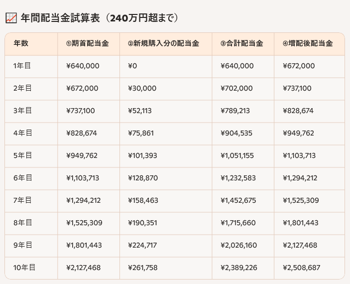 Copilotの計算が正しいか不明ですが、これによれば、6年で年間配当金が120万円を超え、10年後には年間配当金は240万円を超えるようです。思ったよりは早いですね。